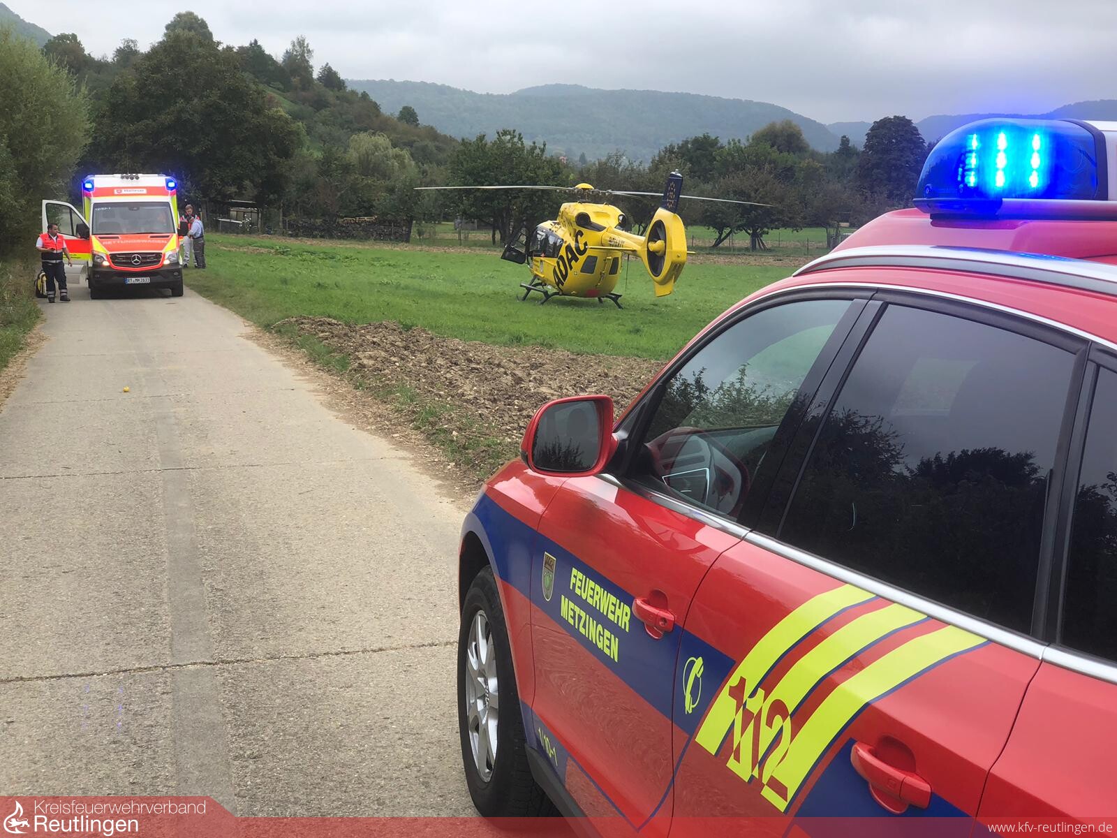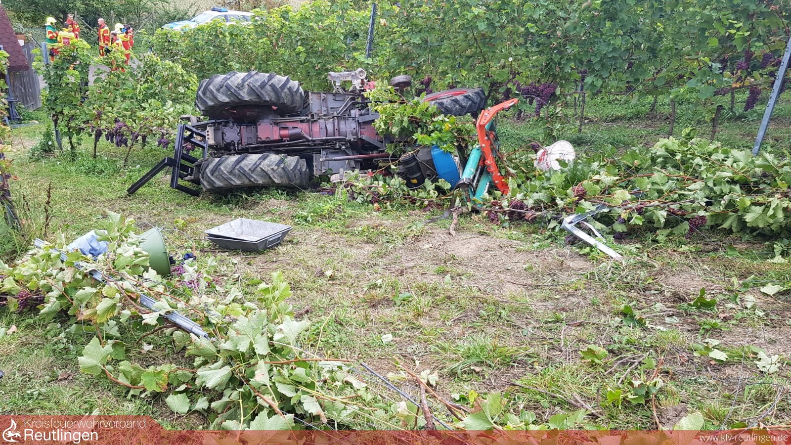 Mit lebensgefährlichen Verletzungen musste ein 47-jähriger Winzer nach einem Unfall im Weinberg ins Krankenhaus gebracht werden. Der Mann war gegen 11.45 Uhr mit seinem Schmalspurtraktor auf dem befestigten Weg im Weinberg oberhalb der Kelternstraße unterwegs. Als er von der Fahrbahn in die mit 36 Prozent abfallende Fahrspur zwischen den Reben einfahren wollte, kam sein Traktor ins Rutschen und verhakte sich mit einem Hinterrad an einem Metallpfosten. Dadurch drehte sich das Fahrzeug seitlich und überschlug sich in dem Gefälle. Der 47-Jährige wurde abgeworfen, kam vor dem Traktor zum Liegen und wurde nachfolgend von dem Gefährt überrollt. Das Fahrzeug rutschte anschließend noch mehrere Meter den Weinberg hinunter, bevor es zum Stillstand kam. Der Winzer musste nach notärztlicher Erstversorgung mit einem Rettungshubschrauber in die Klinik geflogen werden. Zur Unterstützung der Rettungsmaßnahmen war die Feuerwehr Metzingen mit drei Fahrzeugen und zwölf Feuerwehrleuten im Einsatz. (Quelle: Polizeipräsidium Reutlingen)