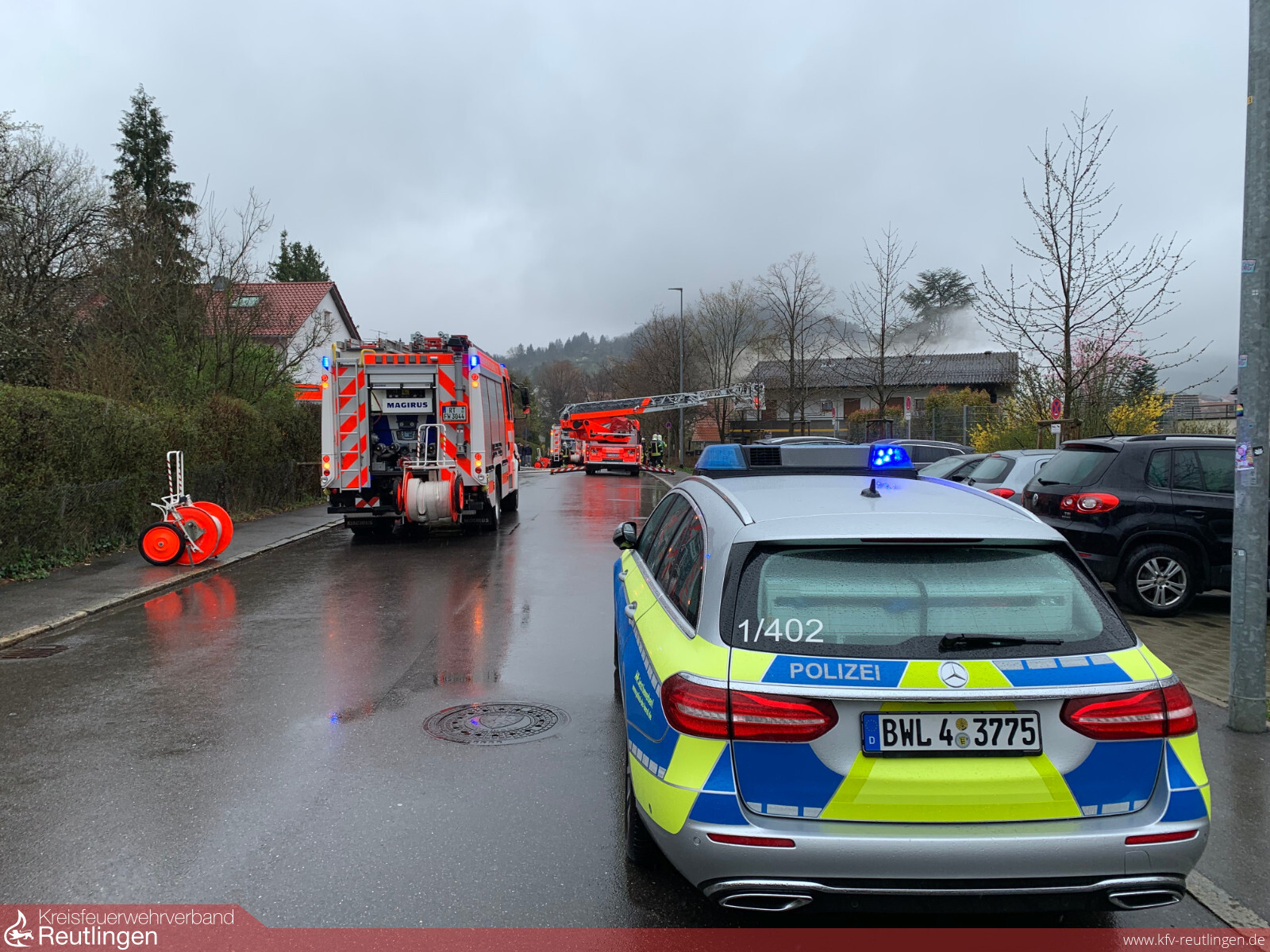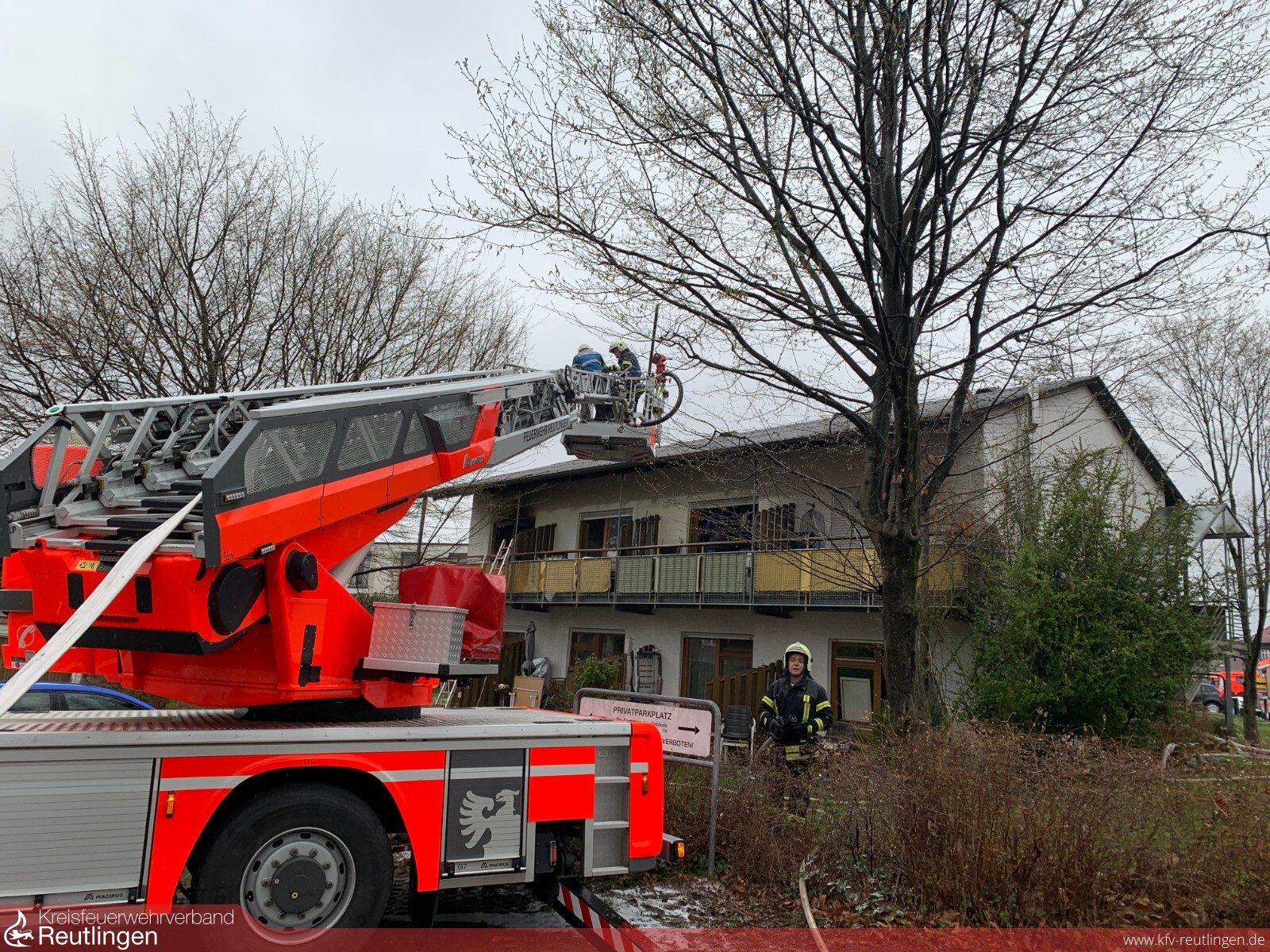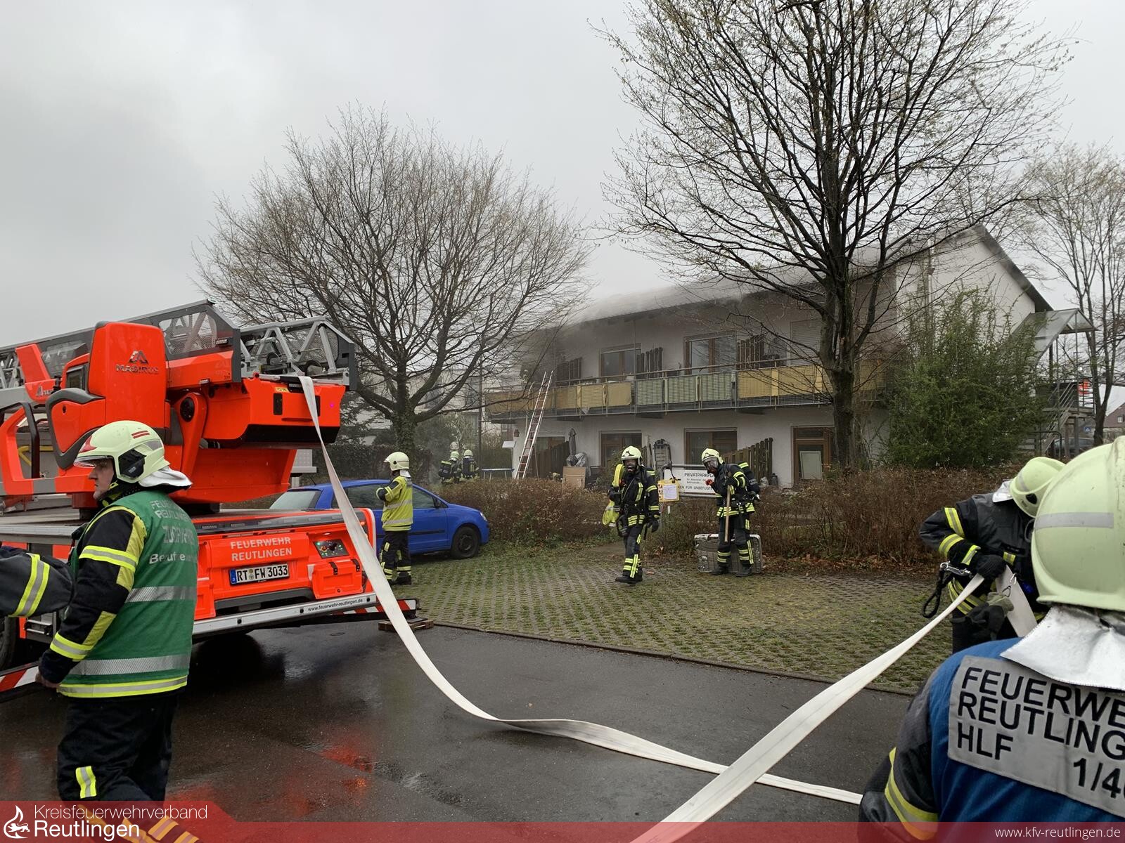In der Mittagszeit meldeten mehrere Anrufer einen Zimmerbrand in einem 2-geschossigen Mehrfamilienhaus in der Reutlinger Bellinostraße. Sofort entsandte die Leitstelle für Feuerwehr und Rettungsdienst einen Löschzug der Berufsfeuerwehr und der Abteilung Freiwillige Feuerwehr Stadtmitte mit 5 Fahrzeugen. Nachdem weitere Anrufer mitteilten, dass sich vermutlich noch Personen im Gebäude befinden und beim Eintreffen bereits dichter Rauch aus dem gesamten Dachbereich drang, erhöhte der Einsatzleiter die Alarmstufe. Von der Feuerwache Hauffstraße rückte somit ein weiterer Löschzug und der Einsatzführungsdienst zur Einsatzstelle aus.