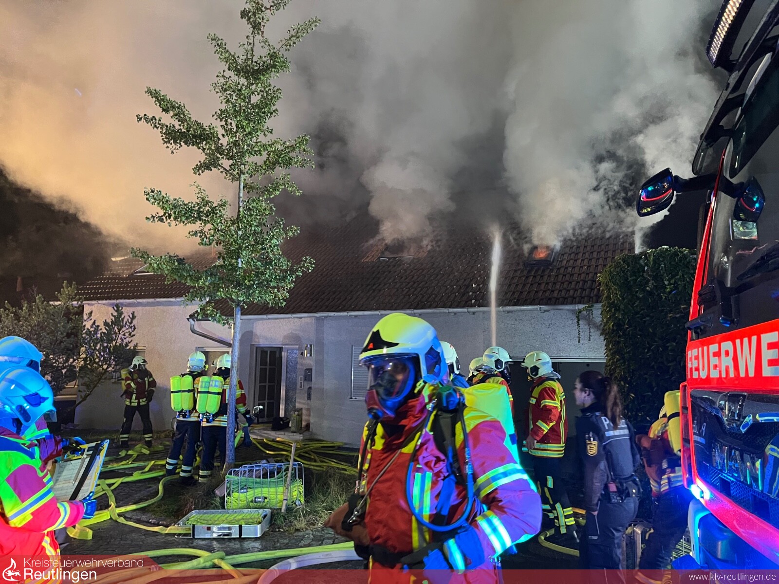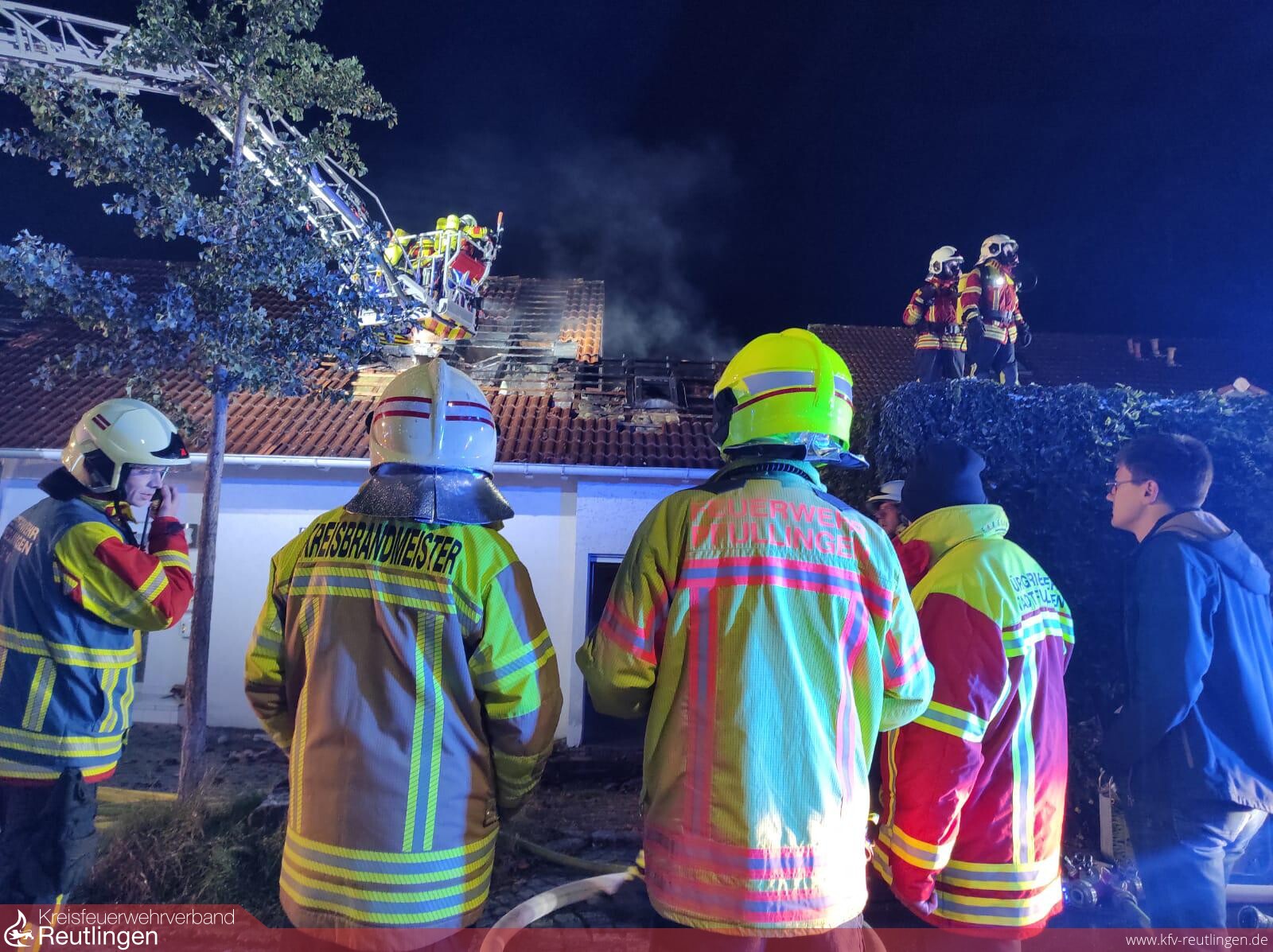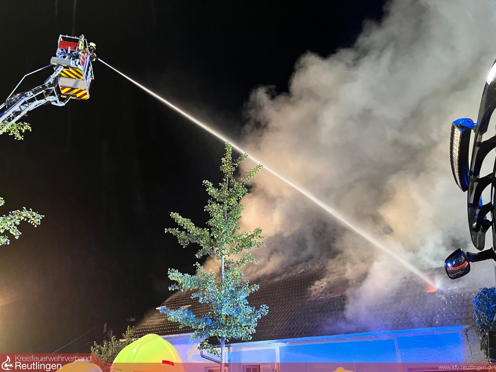 Vom ersten Löschfahrzeug wurde ein Löschrohr unter Atemschutz in das Dachgeschoss zur Brandbekämpfung vorgenommen, welches im weiteren Verlauf durch ein zweites Rohr ergänzte wurde. Über die Drehleiter wurde parallel ein handgeführtes Löschrohr im Außenangriff eingesetzt, ebenso ein weiteres Rohr von der Straße. In der Erstphase bestand die akute Gefahr der Durchzündung des gesamten Dachgeschosses, was aber durch den gezielten Innen- und Außenangriff verhindert und der Brand auf die beiden beim Eintreffen im Vollbrand stehenden Räume begrenzt werden konnte. Durch die enorme Rauch- und Hitzeentwicklung wurde jedoch die gesamte Dachgeschosswohnung beaufschlagt und ist somit aktuell unbewohnbar. Durch den gezielten Einsatz von Löschwasser konnte der Wasserschaden erheblich reduziert werden. Ein Wasserrohrbruch im betroffenen Bad führte jedoch in den darunterliegenden Wohnungen zu massiven Wasseransammlung und entsprechenden Schäden. Im weiteren Einsatzverlauf wurden durch die zuständigen Energieversorger das Gebäude stromlos geschalten und die Wasserzufuhr abgestellt. In aufwändiger, unter Atemschutz durchgeführten Nachlöscharbeiten, wurde die Dachhaut großflächig geöffnet und die vom Brand betroffenen Räume ausgeräumt, um so ein Wiederaufflammen des Brandes zu verhindern. Die betroffenen Bewohner konnten durch die Stadt Pfullingen akut in einem Hotel untergebracht werden, was durch Herrn Bürgermeister Wörner persönlich an der Einsatzstelle koordiniert wurde.