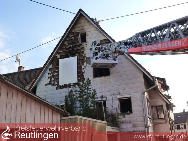 In einem Altbau in der Eninger Bachstraße ist am Mittwoch ein Zimmer ausgebrannt. Das Haus wird von zwei 42 und 51 Jahre alten Brüdern bewohnt. Um 11.36 Uhr unterrichtete einer der Brüder die Rettungskräfte, dass in einem Zimmer ein Feuer ausgebrochen sei. Als Feuerwehr und Polizei kurz darauf eintrafen, schlugen aus einem Giebelfenster im Obergeschoß bereits die Flammen. Beide Brüder standen vor dem Gebäude und waren unverletzt. Sie wurden vor Ort durch den Rettungsdienst betreut. Gegen 12.20 Uhr war der Brand gelöscht. Die Feuerwehr öffnete eine direkt angrenzende Wohnung um sicherzugehen, dass die Flammen nicht auf die benachbarte Gebäudehälfte übergegriffen haben. Die vom Brand betroffene Gebäudehälfte ist vorerst unbewohnbar. Der entstandene Schaden beläuft sich ersten Schätzungen zufolge auf bis zu 60.000 Euro. Die Nacharbeiten der Feuerwehr und der Polizei dauerten noch bis in die Nachmittagsstunden. Noch ist unklar, wie der Brand entstanden ist. Die Kriminalpolizei hat die Ermittlungen zur Ursache aufgenommen. (Quelle: Polizeipräsidium Reutlingen)