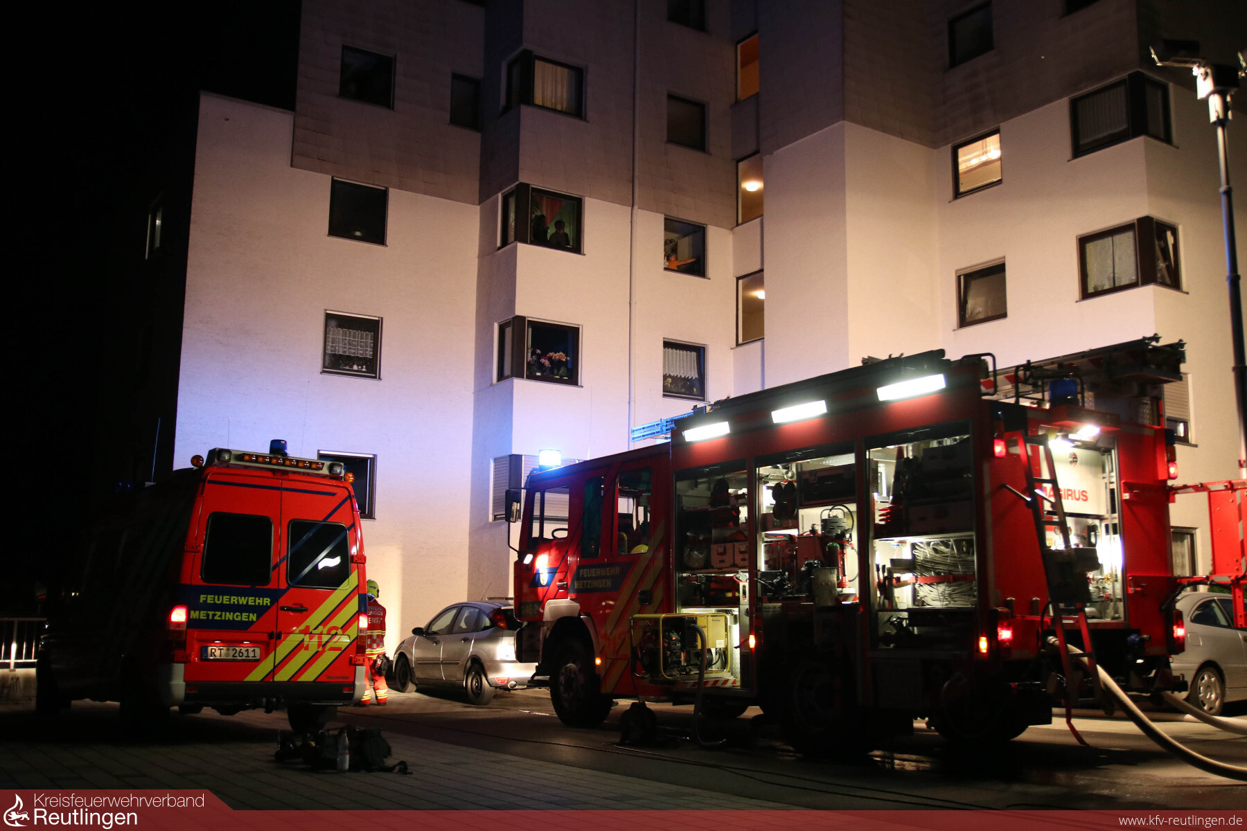 Um 23 Uhr ging der Notruf bei der Leitstelle für Feuerwehr und Rettungsdienst in Reutlingen ein. Bereits zwei Minuten später waren die ersten beiden Fahrzeuge der Feuerwehr Metzingen auf dem Weg zum Einsatzort. Die Einsatzkräfte hatten gerade einen anderen Einsatz beendet, als sie der Einsatzbefehl von der Leitstelle erreichte. Vom Feuerwehrhaus rückten kurze Zeit später ein weiteres Löschfahrzeug und die Drehleiter aus, so dass rund fünf Minuten nach der Alarmierung der komplette Löschzug auf der Anfahrt war.