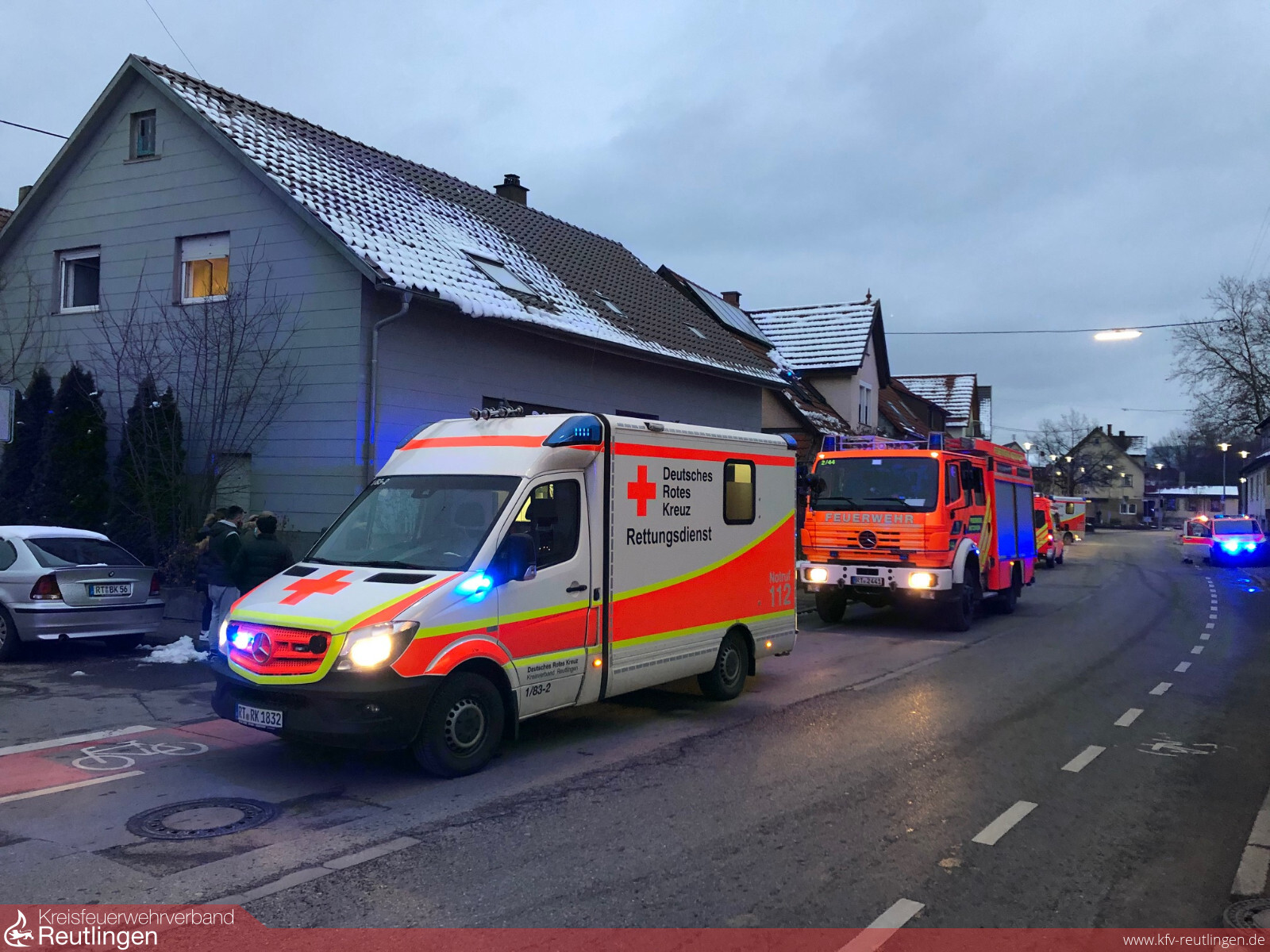 Zu einem Zimmerbrand sind die Abteilungen Neuhausen und Kernstadt der Feuerwehr Metzingen am Freitag in die Metzinger Straße gerufen worden. Als die Feuerwehr am Einsatzort eintraf, ist sie auf einen 38 Jahre alten Mann mit massiven Brandverletzungen gestoßen. Im Zuge der Erkundung stellte sich heraus, dass sich der neunjährige Sohn versehentlich mit einer entzündbaren Flüssigkeit überschüttet hatte. Zu allem Unglück kam er mit einer Zündquelle in Kontakt, so dass das Kind mit seiner Bekleidung in der Wohnung im Obergeschoss in Flammen stand. Der Mann zog sich die schweren Verletzungen zu, als er seinen Sohn geistesgegenwärtig unter die Dusche stellte und ablöschte. Während die Feuerwehr den kleinen Brand rasch gelöscht hatte, kümmerten sich die Besatzungen von zwei Rettungswagen und einem Notarzteinsatzfahrzeug um die beiden Schwerverletzten. Ein angeforderter Rettungshubschrauber konnte wegen schlechter Sichtverhältnisse die Einsatzstelle nicht anfliegen. Der Transport in Spezialkliniken in den Nachbarlandkreisen erfolgte daher bodengebunden. Eine speziell ausgebildete Angehörige der Feuerwehr kümmerte sich um die geschockte Familie. Die Feuerwehr unterstützte die Polizei bei der Sicherung der Wohnung.
