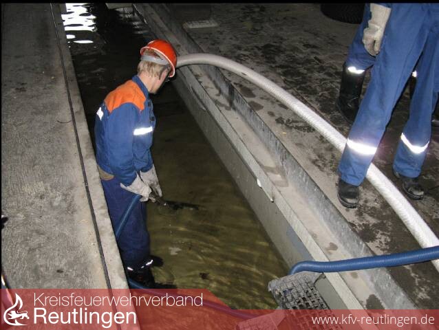 Zum letzten Einsatz an diesem Tag wurde die Jugendfeuerwehr noch einmal ins Industriegebiet alarmiert. In einer Firma hatten sich in einer Montagegrube circa 40cm Wasser gesammelt, die nicht mehr abliefen. Die Jugendfeuerwehr pumpte das Wasser mittels einer Tauchpumpe und eines Wassersaugers aus der Grube ab. Nach diesem Einsatz wurden die Fahrzeuge das letzte Mal für diesen Tag aufgerüstet.