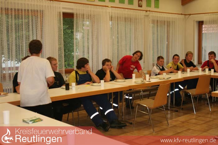 Nach kurzer Tagesablaufvorstellung und Regelfestlegung wurde im Aufenthaltsraum der erste Theorieunterricht abgehalten. Das Thema war „Sichern einer Einsatzstelle“. Um 14:30 Uhr wurde Löschzug 1 und 2 alarmiert, Einsatzbefehl „Flächenbrand an der Ruine Hofen“ – Fehlalarm. Jemand hatte Rauch und Feuer gesehen und die Feuerwehr alarmiert, aber es war nur ein gemütliches Grillfeuer am Samstagmittag!