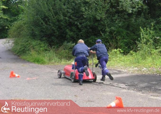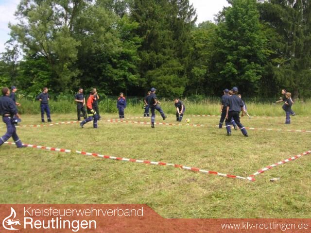 Auf der frisch gemähten Wiese trafen sich bei zeitweise strahlendem Sonnenschein die Jugendfeuerwehrler aus Reutlingen. Das Orga-Team hatte eine Spieleparcour zusammengestellt, der Sport, Teamgeist und Wasserspass verbunden hat.