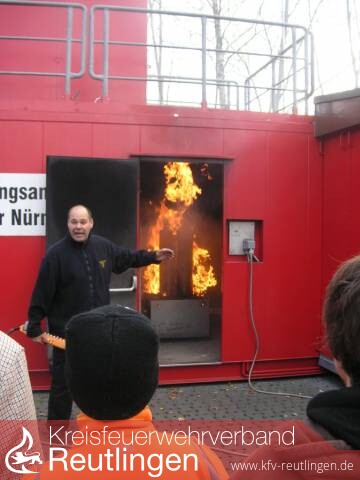 Die Führung durch die Atemschutzanlagen begann in dem „Fitnesspark“ und führte über den Waschbereich in den Bereich der Prüfung und Aufbereitung. In der Brandübungsanlage konnte jeder einmal einen verrauchten Raum durchqueren. Nachdem die erste Scheu überwunden war, konnten die Jugendlichen nicht mehr genug bekommen. Die anschließende Demonstration eines Gasflaschenbrandes und einer Fettexplosion, lies den Puls schon höher schlagen, so dass jeder den Flashover live erleben wollte. Da der eine oder andere in der Aufregung vergaß, den Auslöser am Photo zu drücken, wurde das ganze einfach wiederholt.