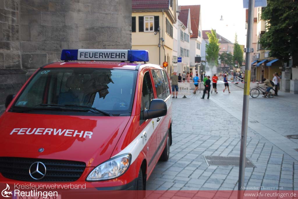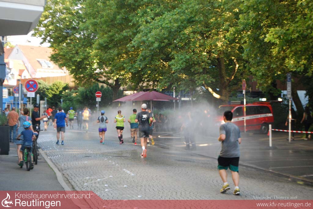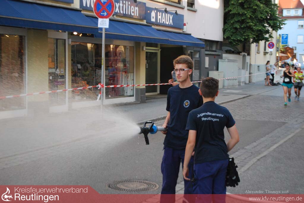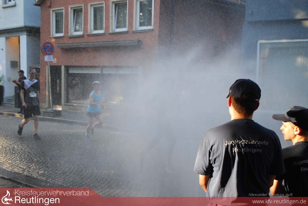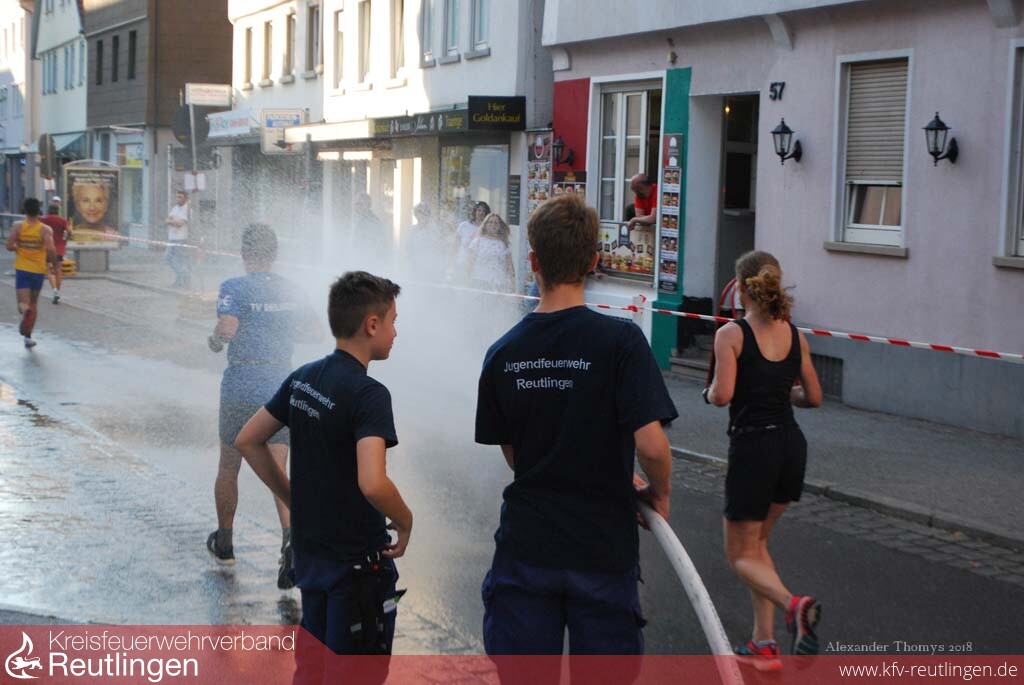 Als sich am Samstagnachmittag rund 1400 Läuferinnen und Läufer beim 26. Reutlinger Altstadtlauf auf die Strecke begaben, war es in den engen Altstadtgassen richtig warm. Abkühlung verschaffte den Sportlern die Jugendfeuerwehr Reutlingen, die mit einem 23-köpfigen Team in der Kanzleistraße und in der Metzgerstraße für Abkühlung sorgte.