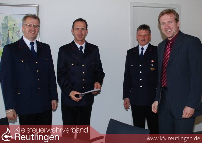 Bild: von links nach rechts: Harald Herrmann, Kommandant, Dr. Georg Belge, Gerhard Nagel von der Freiwilligen Feuerwehr und Bürgermeister Peter Rist.